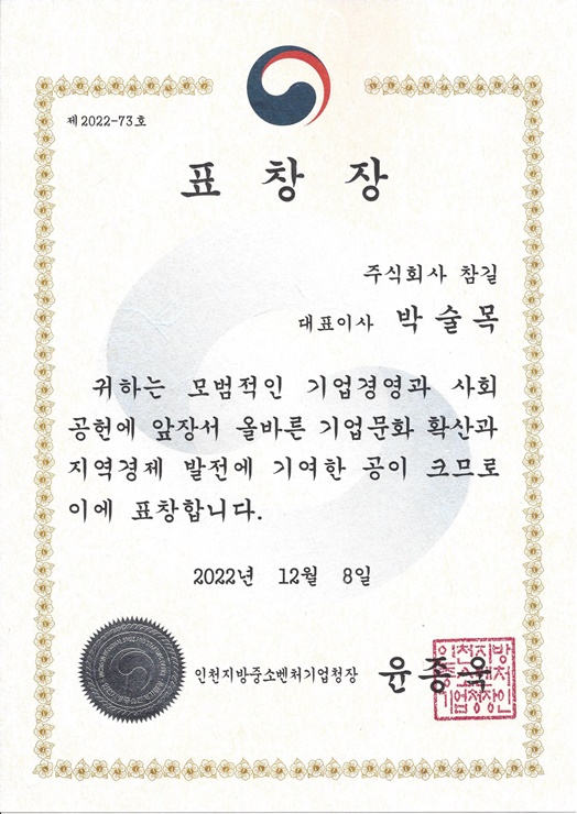 인천지방중소벤처기업청장 표창장 수상 및 인천경영포럼 송년의 밤 행사 참석 페이지 정보 작성자 최고관리자 작성일22-12-09 13:10 조회24,847회 댓글0건 관련링크 본문 인천지방중소벤처기업청장 표창장 수상 및 인천경영포럼 송년의 밤 행사 참석 댓글목록 등록된 댓글이 없습니다. 이전글 다음글 목록